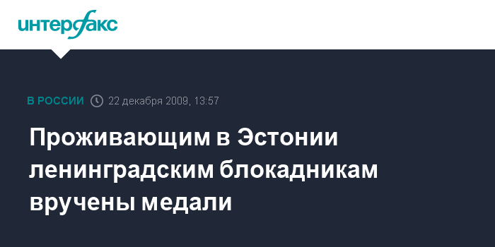 Москва. 22 декабря. INTERFAX.RU - В российском посольстве в Таллине во вторник состоялась торжественная церемония вручения проживающим в Эстонии бывшим ленинградским блокадникам медали "В честь 65-летия полного освобождения Ленинграда от фашистской блокады". Хочу поблагодарить вас за подвиг, совершенный во имя жизни и победы в годы войны, поздравить с наступающими праздниками, а также отметить, что в таком торжественном стиле мы уже сегодня начинаем подготовку к празднованию 65-летию победы в Великой Отечественной войне", - сказал посол РФ в Эстонии Николай Успенский.
