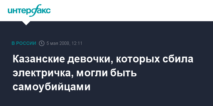 Казань. 5 мая. INTERFAX.RU - Причиной гибели двух 14-летних девочек, которых сбила электричка на окраине Казани, могли стать несчастный случай или самоубийство, сообщила пресс-секретарь Казанского ЛУВД на транспорте Гульнара Мухаметжанова.