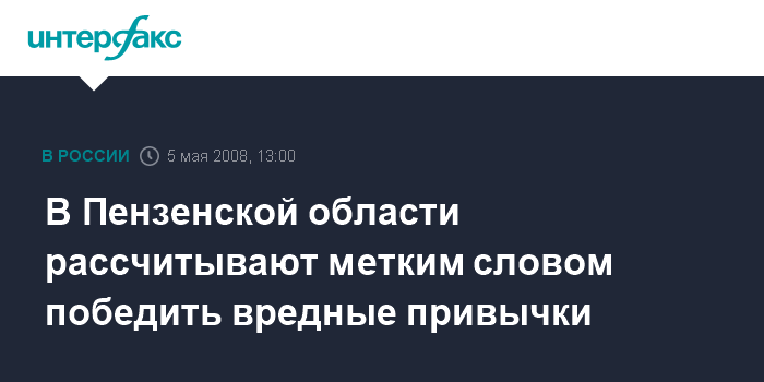 Пенза. 5 мая. INTERFAX.RU - Первый региональный конкурс на лучший слоган, направленный на борьбу с вредными привычками, проходит в Пензенской области. Конкурс проводится во всех муниципальных образованиях области среди учащейся и студенческой молодежи и направлен на критику ненормативной лексики, курения, потребления наркотиков, сообщает пресс-служба регионального министерства культуры.