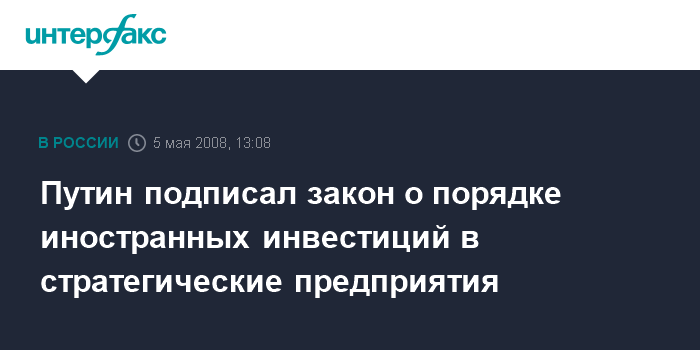 Москва. 5 мая. INTERFAX.RU - Президент России Владимир Путин подписал федеральный закон "О порядке осуществления иностранных инвестиций в хозяйственные общества, имеющие стратегическое значение для обеспечения обороны страны и безопасности государства", сообщает в понедельник пресс-служба Кремля.