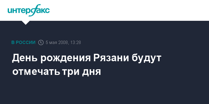 Рязань. 5 мая. INTERFAX.RU - В этом году День города в Рязани будет отмечаться с 30 мая по 1 июня, сообщили "Интерфаксу" в понедельник в пресс-центре администрации города. По словам собеседника агентства, торжественное открытие праздника в честь 913-летия Рязани планируется провести 30 мая в концертном зале им. Есенина, где будут объявлены новые Почетные граждане города, пройдет чествование семейных династий.