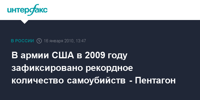 Вашингтон. 16 января. INTERFAX.RU - Количество самоубийств в вооруженных силах США в 2009 году поставило рекорд, увеличившись до 160 по сравнению с 140 суицидами в 2008 году, сообщает интернет-сайт газеты "Майами геральд" со ссылкой на информацию, опубликованную американскими военными. "Нет сомнений, что, если говорить о самоубийствах, 2009 год стал очень болезненным для вооруженных сил", - заявил представитель подразделения по борьбе с суицидами в вооруженных силах США полковник Кристофер Филбрик. Как отмечается в докладе Пентагона, основной причиной роста количества суицидов стала депрессия среди военнослужащих, вызванная напряжением от многолетних военных операций в Ираке и Афганистане.