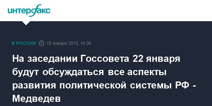 Завидово. 16 января. INTERFAX.RU - Президент РФ Дмитрий Медведев намерен 22 января созвать заседание Госсовета, посвященное развитию политической системы страны. "Я решил провести Госсовет, посвященный развитию политической системы", - сообщил Д.Медведев на встрече в субботу с руководителями парламентских партий, добавив, что заседание запланировано на 22 января. Президент предложил поговорить на этом заседании обо всех аспектах развития политической системы: о развитии политических институтов, партийных институтов, партийной демократии, местного самоуправления, судебной и правоохранительной системы.