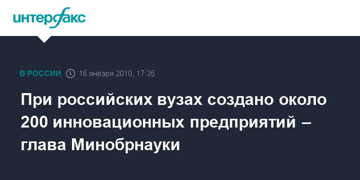 Ново-Огарево. 16 января. INTERFAX.RU - В России уже создано порядка 200 малых высокотехнологичных инновационных предприятий при вузах, сообщил глава Минобрнауки Андрей Фурсенко на встрече с премьер-министром РФ Владимиром Путиным. "Соответствующие решения приняты, и теперь важно, чтобы они были реализованы на практике", - сказал В.Путин, попросив А.Фурсенко доложить о том, как развивается ситуация. "По нашим оценкам, порядка 200 малых предприятий уже создано. Я могу назвать среди городов, в которых этот процесс при вузах наиболее активно идет, - Томск, Чебоксары, где не так давно первые предприятия заработали", - отметил глава Минобрнауки.