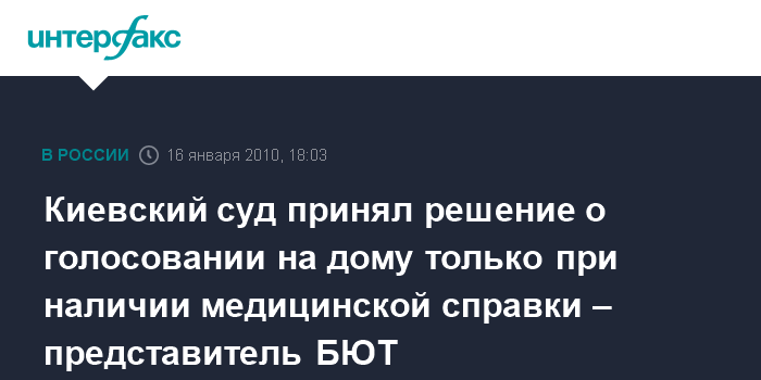 Киев. 16 января. INTERFAX.RU - Апелляционный административный суд Киева в субботу принял решение, которым постановил, что голосование на дому должно происходить исключительно с подтверждением медицинской справкой. Решение суда является окончательным и обжалованию не подлежит. Об этом сообщает пресс-служба БЮТ со ссылкой на информацию народного депутата (фракция Блока Юлии Тимошенко) Валерия Писаренко.