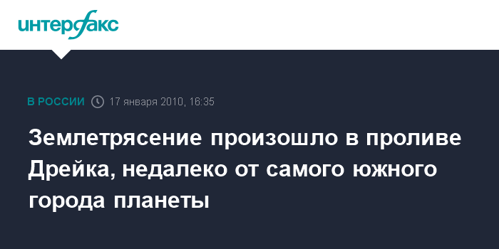 Лондон. 17 января. INTERFAX.RU - Землетрясение мощностью 6,3 балла произошло в воскресенье в Атлантическом океане, недалеко от южного побережья Аргентины, сообщает британская телерадиовещательная корпорация со ссылкой на Геологическую службу США. Эпицентр землетрясения находился примерно в 354 км от аргентинского города Ушуая, считающегося самым южным городом Земли, в проливе Дрейка на глубине 21 км. На данный момент сведений о разрушениях или пострадавших не поступало.