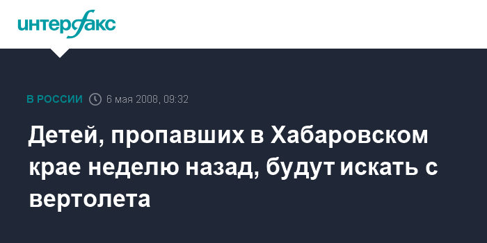 Хабаровск. 6 мая. INTERFAX.RU - Вертолет МИ-8 Дальневосточной авиабазы по охране лесов подготовлен для участия в операции по поиску трех мальчиков, пропавших в поселке Ягодный Комсомольского района Хабаровского края неделю назад. После улучшения погоды вертолет вылетит на поиски, сообщили агентству "Интерфакс" в пресс-службе краевого УВД.
