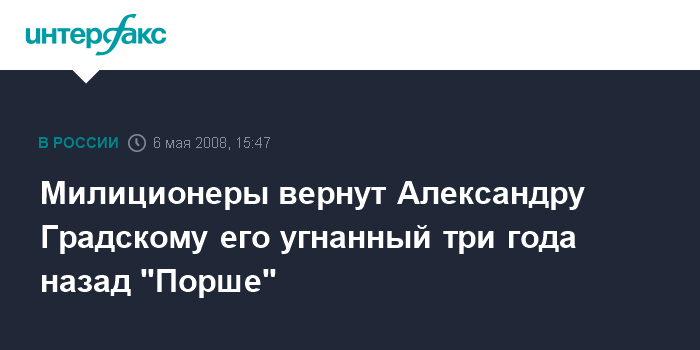 Москва. 6 мая. INTERFAX.RU - В городе Братске Иркутской области обнаружен угнанный в декабре 2005 г. в центре Москвы автомобиль "Порше Кайен", принадлежавший известному певцу и композитору Александру Градскому.
