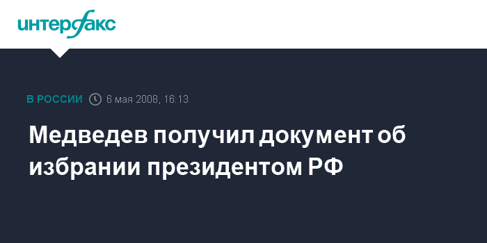 Москва. 6 мая. INTERFAX.RU - Избранный президент Дмитрий Медведев во вторник провел рабочую встречу с главой ЦИК Владимиром Чуровым. Председатель Центральной избирательной комиссии В.Чуров в соответствии со своими обязанностями передал Дмитрию Медведеву документ, подтверждающий факт избрания Д.Медведева президентом РФ, сообщила пресс-служба главы государства.