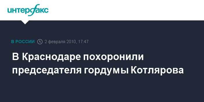 Москва. 2 февраля. INTERFAX.RU - В Краснодаре во вторник прощались с погибшим в автокатастрофе председателем городской Думы Николаем Котляровым. Как сообщает пресс-служба администрации города, Котлярова отпевали в Свято-Екатерининском храме, затем в органном зале мэрии состоялась гражданская панихида, и после полудня прошли похороны на Славянском кладбище.