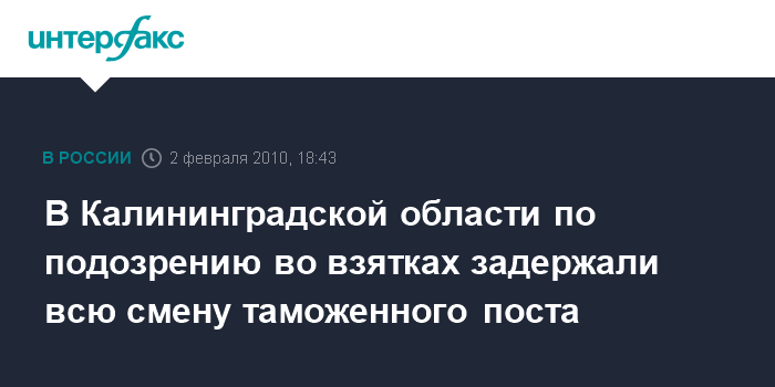 Калининград. 2 февраля. INTERFAX.RU - Вся смена сотрудников таможенного поста "Калининградский" регионального таможенного управления задержана во вторник по подозрению в получении взяток, сообщил "Интерфаксу" представитель регионального УВД.