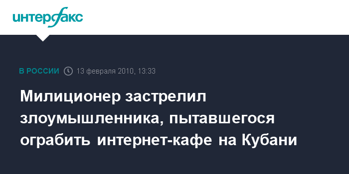 Москва. 13 февраля. INTERFAX.RU - Попытка разбойного нападения на интернет-кафе в Геленджике (Краснодарский край) закончилось гибелью злоумышленника, которого застрелил прибывший по вызову работников клуба милиционер.
