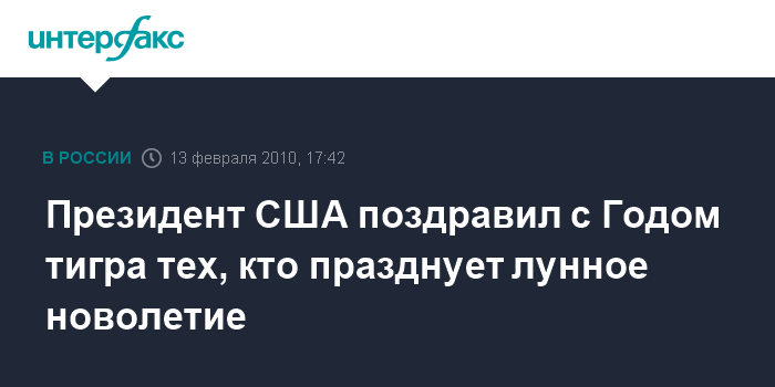 Москва. 13 февраля. INTERFAX.RU - Президент США Барак Обама в субботу поздравил всех празднующих Новый год по лунному календарю с наступающим 14 февраля Годом тигра.