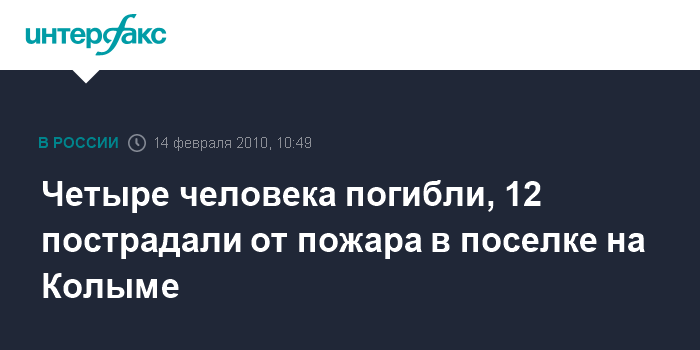 Якутск. 14 февраля. INTERFAX.RU - Пожар в жилом доме произошел в поселке Черский - районном центре на северо-востоке Якутии: погибли четыре человека, 12 пострадали. Сообщение о пожаре в одной из квартир 4-х этажного жилого дома в поселке Черский поступило на пульт службы спасения "01" в воскресенье в 06:40 местного времени (22:40 мск), сообщает территориальное управление МЧС. "Прибывшие пожарные эвакуировали из здания 38 человек и не допустили распространение огня, спасли жилой дом", - отмечают в МЧС.