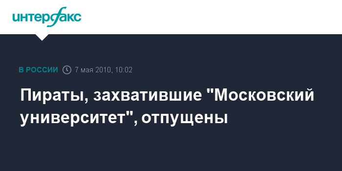 Москва. 7 мая. INTERFAX.RU - Минобороны России официально подтвердило сообщение о том, что пираты, захватившие танкер "Московский университет", отпущены. Как рассказал "Интерфаксу-АВН" в пятницу начальник управления пресс-службы и информации Минобороны РФ полковник Алексей Кузнецов, это связано с несовершенством международной нормативно-правовой базы.