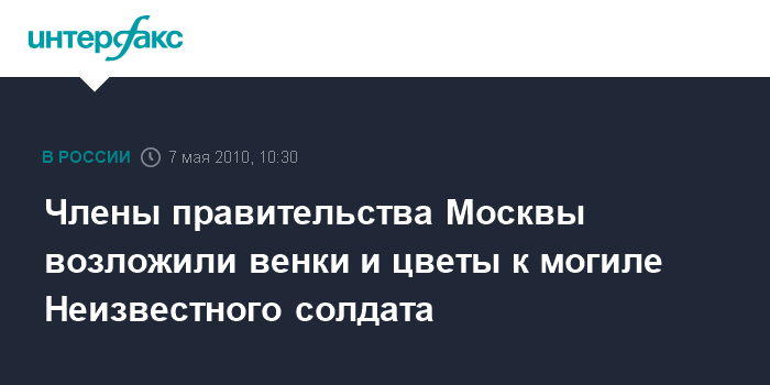 Москва. 7 мая. INTERFAX.RU - В преддверии празднования 65 годовщины победы в Великой Отечественной войне в пятницу утром прошла торжественная церемония возложения венков и цветов к могиле Неизвестного солдата с участием членов правительства Москвы.