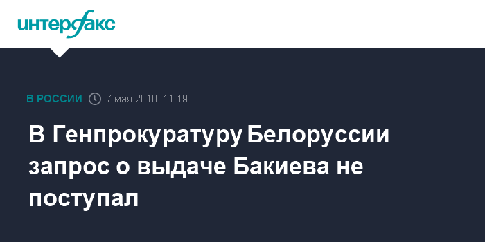 Москва. 7 мая. INTERFAX.RU - Генеральная прокуратура Белоруссии не получала запроса о выдаче Курманбека Бакиева, заявил агентству "Интерфакс-Запад" в пятницу начальник отдела информации и связей с общественностью Генпрокуратуры Белоруссии Петр Киселев.