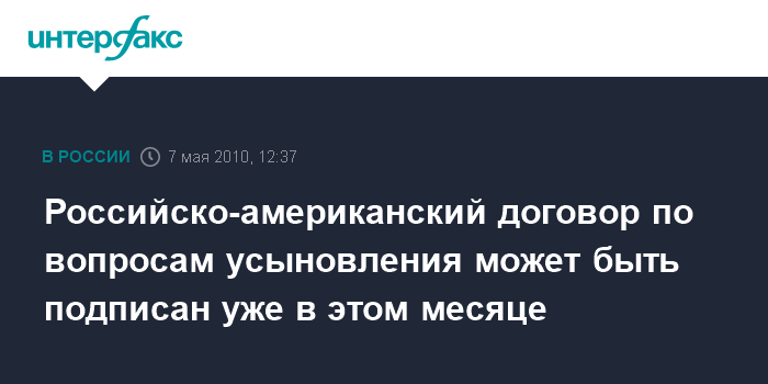 Москва. 7 мая. INTERFAX.RU - Договор, регулирующий отношения усыновления между США и Россией, может быть заключен к концу мая, заявил уполномоченный по правам ребенка Павел Астахов в пятницу "Интерфаксу". По его словам, в настоящее время Россия готовит двусторонние договора о сотрудничестве в области международного усыновления с США, Великобританией, Испанией, Финляндией и Францией.