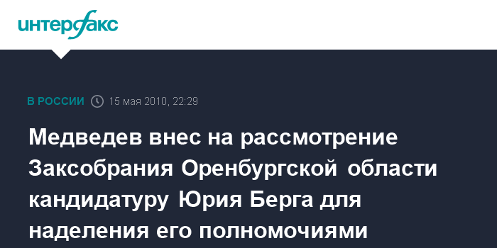 Москва. 15 мая. ИНТЕРФАКС - Президент России Дмитрий Медведев внес на рассмотрение Законодательного собрания Оренбургской области кандидатуру Юрия Берга для наделения его полномочиями главы администрации (губернатора) этого субъекта Федерации, сообщает в субботу пресс-служба Кремля.