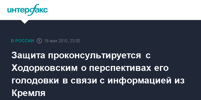 Москва. 18 мая. ИНТЕРФАКС - Адвокаты обсудят с экс-главой "ЮКОСа" Михаилом Ходорковским возможность прекращения его голодовки после того, как стало известно, что президент ознакомился с его обращением к председателю Верховного суда.