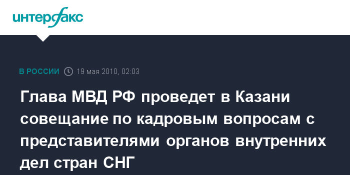Казань. 19 мая. ИНТЕРФАКС-ПОВОЛЖЬЕ - Совещание руководителей кадровых аппаратов министерств внутренних дел стран СНГ пройдет 19-20 мая в Казани (Татарстан).