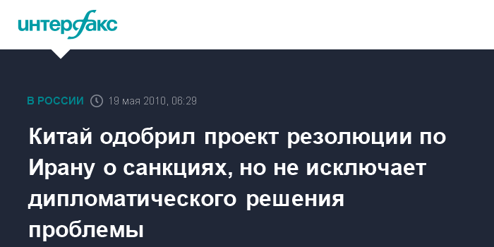 "Пять стран - постоянных членов СБ ООН и Германия во второй половине дня 18 мая 2010 года распространили в СБ ООН проект резолюции с санкциями против Ирана. Однако это не означает, что дверь для дипломатического решения ядерной проблемы Ирана уже закрыта", - приводят СМИ заявление китайского представителя.