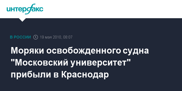 Москва. 19 мая. INTERFAX.RU - Моряки экипажа освобождённого от пиратов танкера "Московский университет" вернулись домой, передает телеканал "Россия 24". Из столицы они прилетели в Краснодар. Там в аэропорту их ждали с цветами родные и близкие.