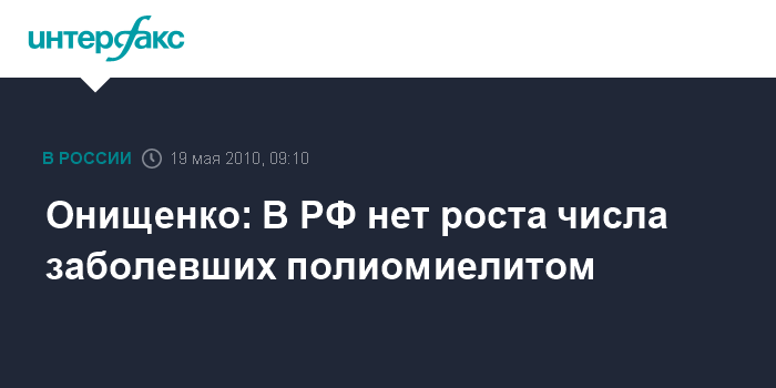 Москва. 19 мая. INTERFAX.RU - В России зафиксировано два случая заболевания полиомиелитом детей, прибывших из Таджикистана, информация о том, что таких случаев больше не соответствует действительности, заявил "Интерфаксу" в среду глава Роспотребнадзора, государственный санитарный врач РФ Геннадий Онищенко.