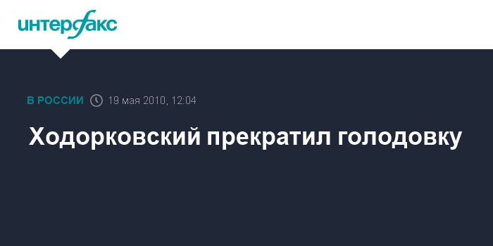 Москва. 19 мая. INTERFAX.RU - Экс-глава НК "ЮКОС" Михаил Ходорковский заявил, что прекращает голодовку. "Цель обращения достигнута. Голодовку прекращаю", - говорится в заявлении Ходорковского, распространенном в среду пресс-центром его адвокатов.