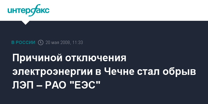 Москва. 20 мая. INTERFAX.RU - Причиной аварии, приведшей к отключению электроэнергии в более чем 30 районах Чечни, стал обрыв линии электропередачи в высокогорных районах республики, сообщили ""Интерфаксу" в РАО "ЕЭС России". "Всю ночь шел обход линии. Место отрыва нашли и сейчас ведутся работы по восстановлению ЛЭП ", - сказал собеседник агентства.