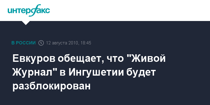 Магас. 12 августа. INTERFAX.RU - Доступ к Живому Журналу (livejournal.com) для жителей Ингушетии, заблокированному по указанию республиканской прокуратуры, будет восстановлен в ближайшее время, заявил президент республики Юнус-Бек Евкуров.