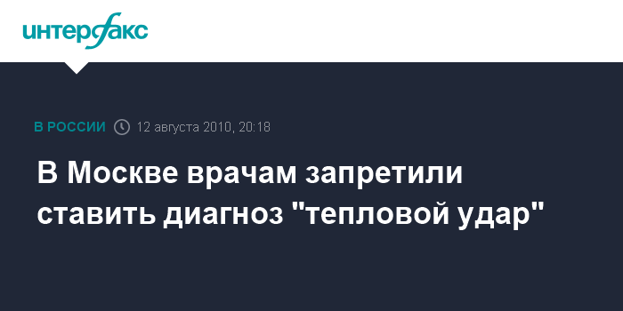 Москва. 12 августа. INTERFAX.RU - Опрошенные корреспондентом "Интерфакса" врачи нескольких лечебных учреждений Москвы признали, что теперь медицинским работникам запрещено ставить диагноз "тепловой удар".