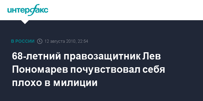 Москва. 12 августа. ИНТЕРФАКС - Лидеру движения "За права человека" Льву Пономареву, задержанному милицией за участие в митинге в Москве, стало плохо.