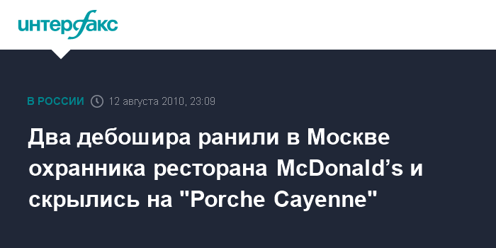 Москва. 12 августа. ИНТЕРФАКС - В Москве на Большой Дорогомиловской улице 8а двое неизвестных посетителей заведения быстрого питания McDonald‘s ранили охранника ресторана из травматического пистолета и скрылись, сообщил в четверг "Интерфаксу" источник в правоохранительных органах. Затем напавшие скрылись на автомобиле "Porche Сayenne".