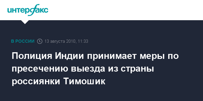 Москва. 13 августа. INTERFAX.RU - Полиция Пенджаба в ночь в пятницу разослала уведомления во все аэропорты Индии, чтобы пресечь возможность выезда из страны россиянки Ольги Тимошик, обвиняемой в нарушении визового режима, сообщили в пятницу индийские СМИ.