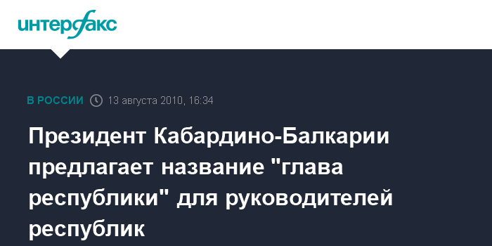 Нальчик. 13 августа. INTERFAX.RU - Президент Кабардино-Балкарии Арсен Каноков поддерживает идею о переименовании должностей президентов республик. Так же, как и Кадыров, он считает, что президент в стране должен быть один, и предлагает название "глава республики".