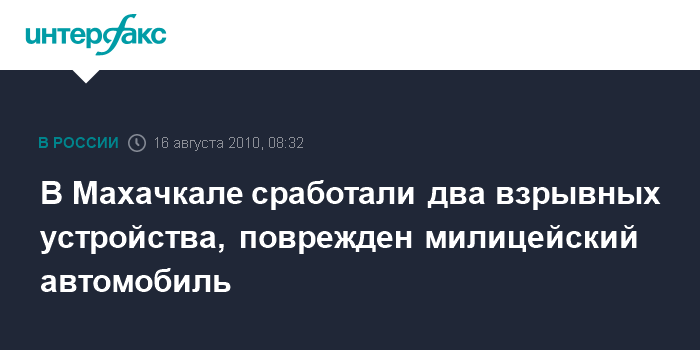 Москва. 16 августа. INTERFAX.RU - Два взрывных устройства сработали в ночь на понедельник на улице Казбекова в Махачкале, пострадавших нет, сообщили "Интерфаксу" в пресс-службе МВД Дагестана.