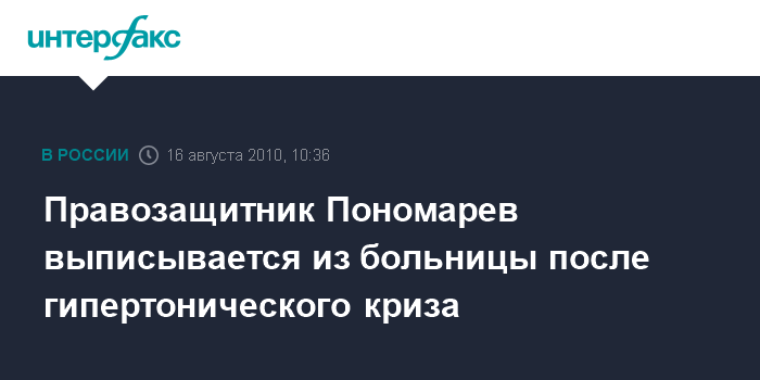 "Сегодня меня выписывают. Чувствую себя хорошо. Был гипертонический криз, но, к счастью, его быстро купировали", - сказал Пономарев "Интерфаксу".