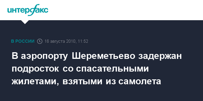 Москва. 16 августа. INTERFAX.RU - Сотрудники милиции аэропорта Шереметьево задержали несовершеннолетнего, у которого было обнаружено 4 спасательных жилета из самолета "Аэрофлота", сообщили "Интерфаксу" в пресс-группе линейного УВД в аэропорту Шереметьево в понедельник.