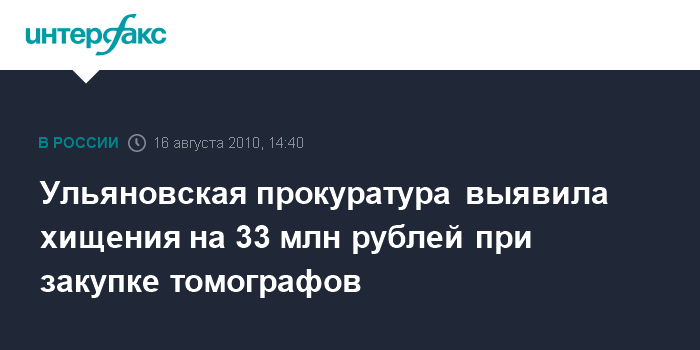 Ульяновск. 16 августа. INTERFAX.RU - В Ульяновской области решается вопрос о возбуждении уголовного дела по факту мошенничества с финансовыми ресурсами, выделенными для закупки компьютерных томографов для медучреждений области, сообщает Генпрокуратура РФ.