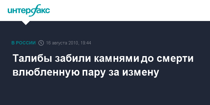 Лондон. 16 августа. INTERFAX.RU - Влюбленная пара, обвиненная в адюльтере, была забита камнями до смерти в северной афганской провинции Кундуз по инициативе движения "Талибан", сообщила в понедельник BBC.