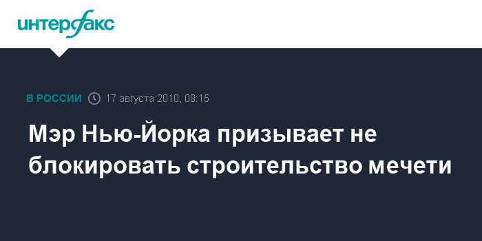Москва. 17 августа. INTERFAX.RU - Мэр Нью-Йорка призвал не блокировать строительство мечети на месте Всемирного торгового центра, разрушенного 11 сентября 2001 года.