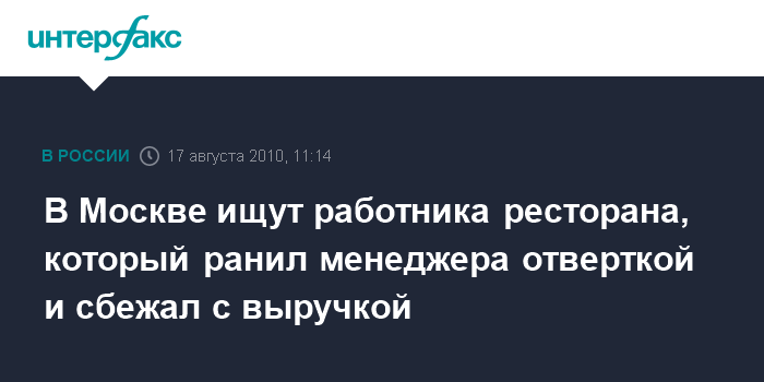 Милиционеры, прибыв на место происшествия, установили, что рабочий ресторана причинил несколько ранений менеджеру, после чего забрал 190 тыс. руб. и скрылся, сообщил источник.