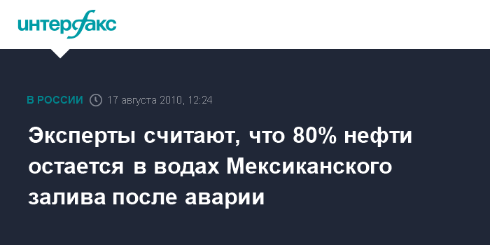 Орландо. 17 августа. INTERFAX.RU - До 79% нефти, попавшей в Мексиканский залив после апрельской аварии на платформе BP, по-прежнему остается в водах залива, несмотря на заверения правительства США о том, что нефтяные пятна быстро сокращаются и местами полностью исчезли, утверждает группа независимых экспертов.