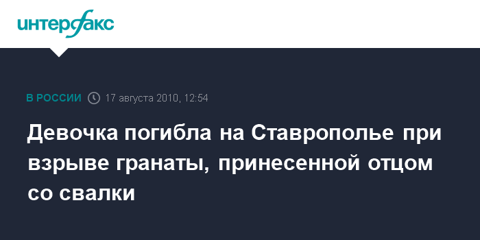 Москва. 17 августа. INTERFAX.RU - Следствие установило причастность к гибели 11-летней девочки на Ставрополье ее отца, который принес в дом гранату Ф-1, сообщила агентству "Интерфакс" во вторник старший помощник руководителя СУ СКП РФ по Ставропольскому краю Екатерина Данилова во вторник.