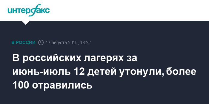 Москва. 17 августа. INTERFAX.RU - В России в детских лагерях отдыха за два летних месяца из-за несоблюдения правил поведения на воде погибли 12 детей, сообщает Генпрокуратура РФ по итогам проверки исполнения законодательства в сфере организации отдыха и оздоровления детей.