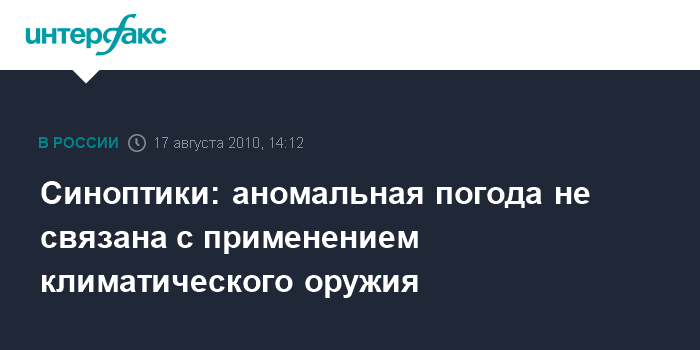 Санкт-Петербург. 17 августа. ИНТЕРФАКС СЕВЕРО-ЗАПАД - Ученые-синоптики не могут назвать и объяснить точную причину погодных аномалий в российской природе текущим летом, но убеждены, что жара не была следствием применения какого-либо климатического оружия.