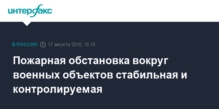 Пожарная обстановка вокруг военных объектов остается стабильной и контролируемой, говорится в сообщении управления пресс-службы и информации Минобороны, поступившем в "Интерфакс-АВН" во вторник.