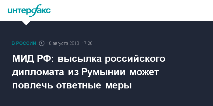 Москва. 18 августа. INTERFAX.RU - МИД России заявляет, что оставляет за собой право на ответные меры в связи с высылкой российского дипломата из Бухареста.