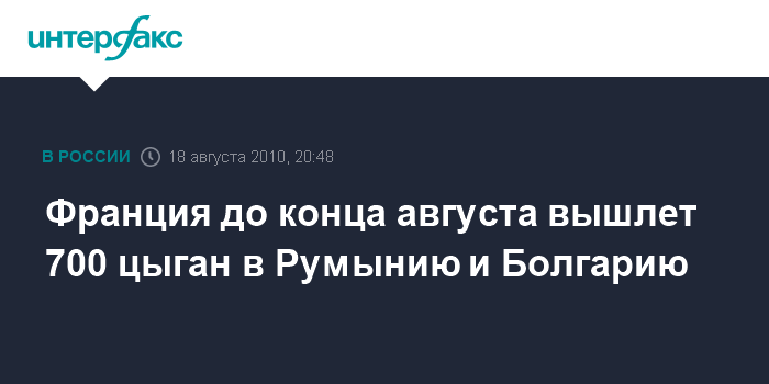 Москва. 18 августа. INTERFAX.RU - Власти Франции готовят операцию по высылке до конца августа в Румынию и Болгарию 700 цыган, нелегально проживающих на французской территории, сообщает в среду радиостанция France Info.